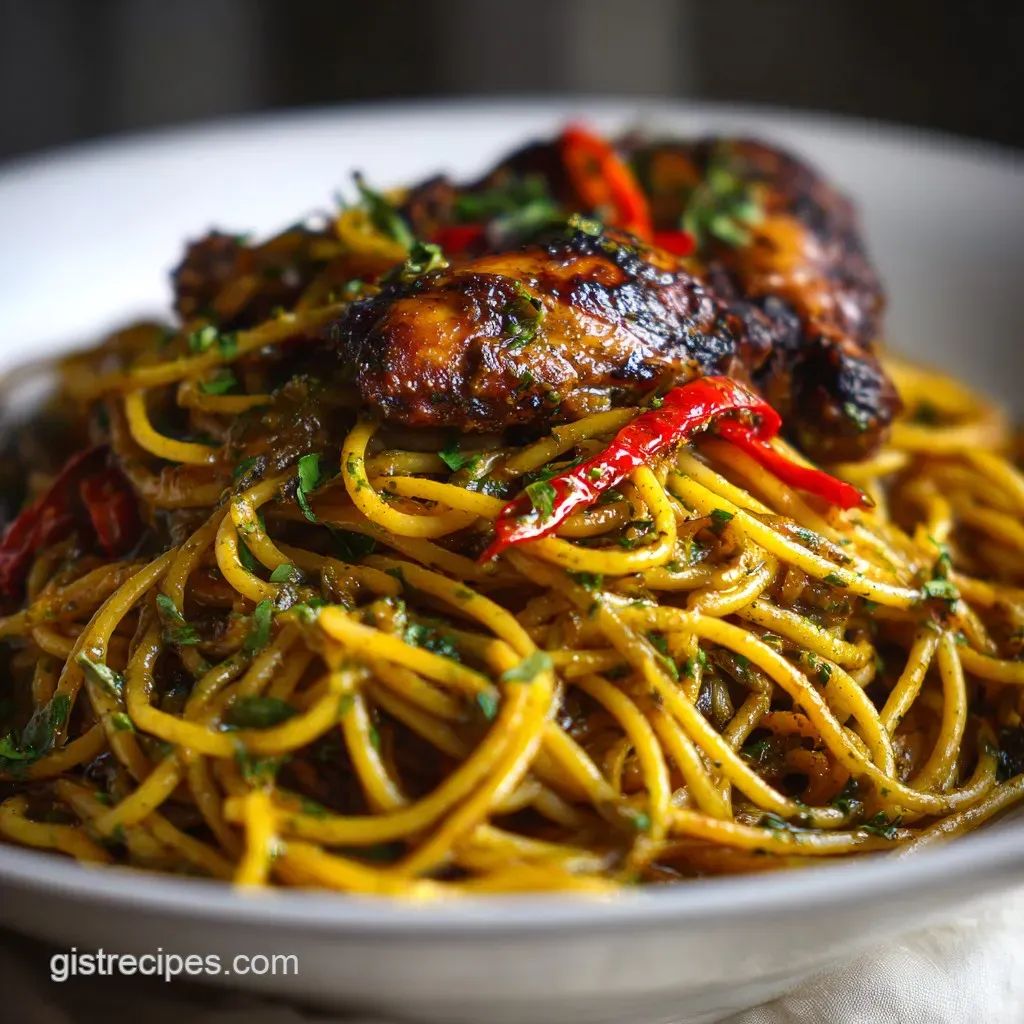 Aromatic Layering: Sautéing the julienned onions and garlic in the leftover chicken fat (fond) captures the fat soluble flavor compounds from the jerk rub.
