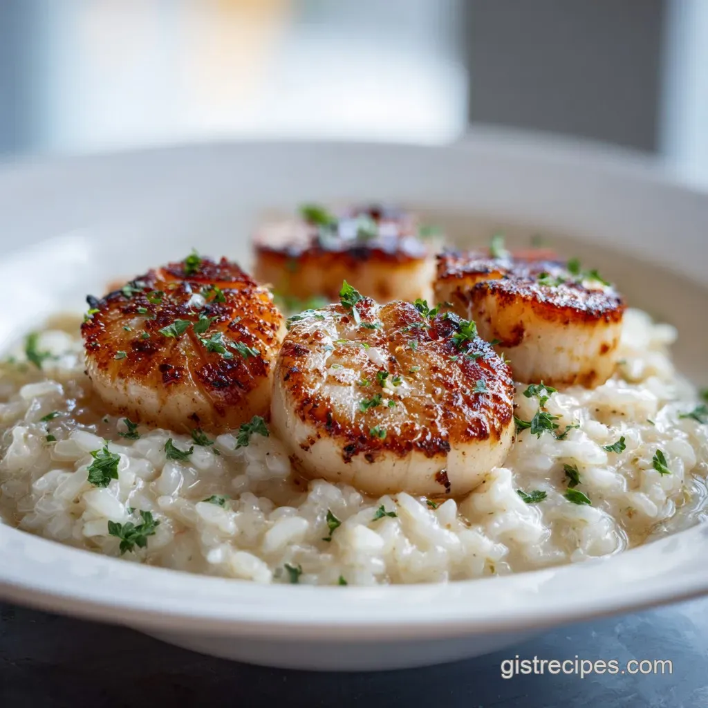 - Plating. Spoon the risotto into warm bowls and top with the seared scallops and fresh chives.